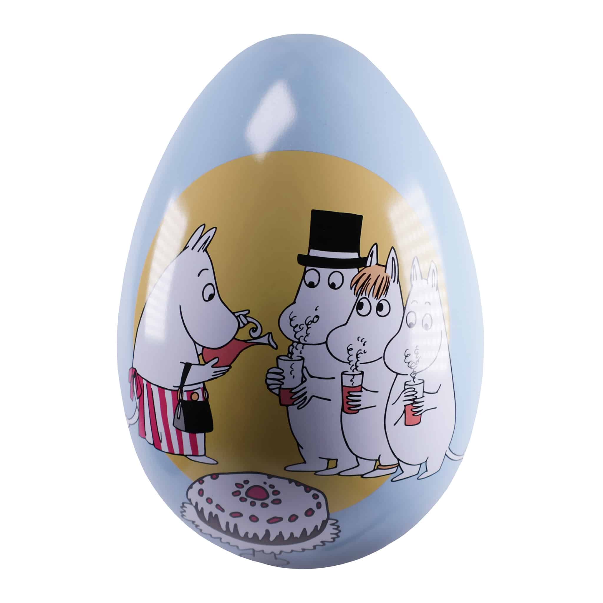 Påskägg i plåt med vackra Mumin-illustrationer.